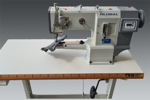 Eennaalds, cilinderarm, drievoudig transport naaimachine met een direct aangedreven motor en geïntegreerde bedieningsveld.